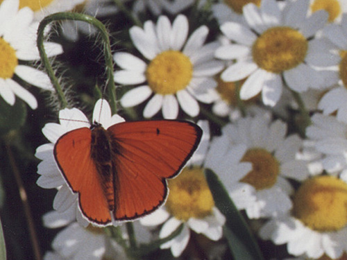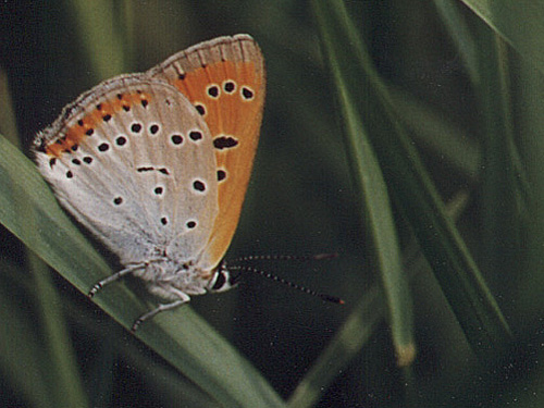 Männchen ist leuchtend orange und gleicht daher dem etwas kleineren Dukatenfalter. Er liebt feuchte Wiesen mit gutem Bestand von