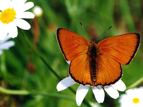 Der Dukatenfalter ist durch seine leuchtend orangene Flügeloberseite (nur beim